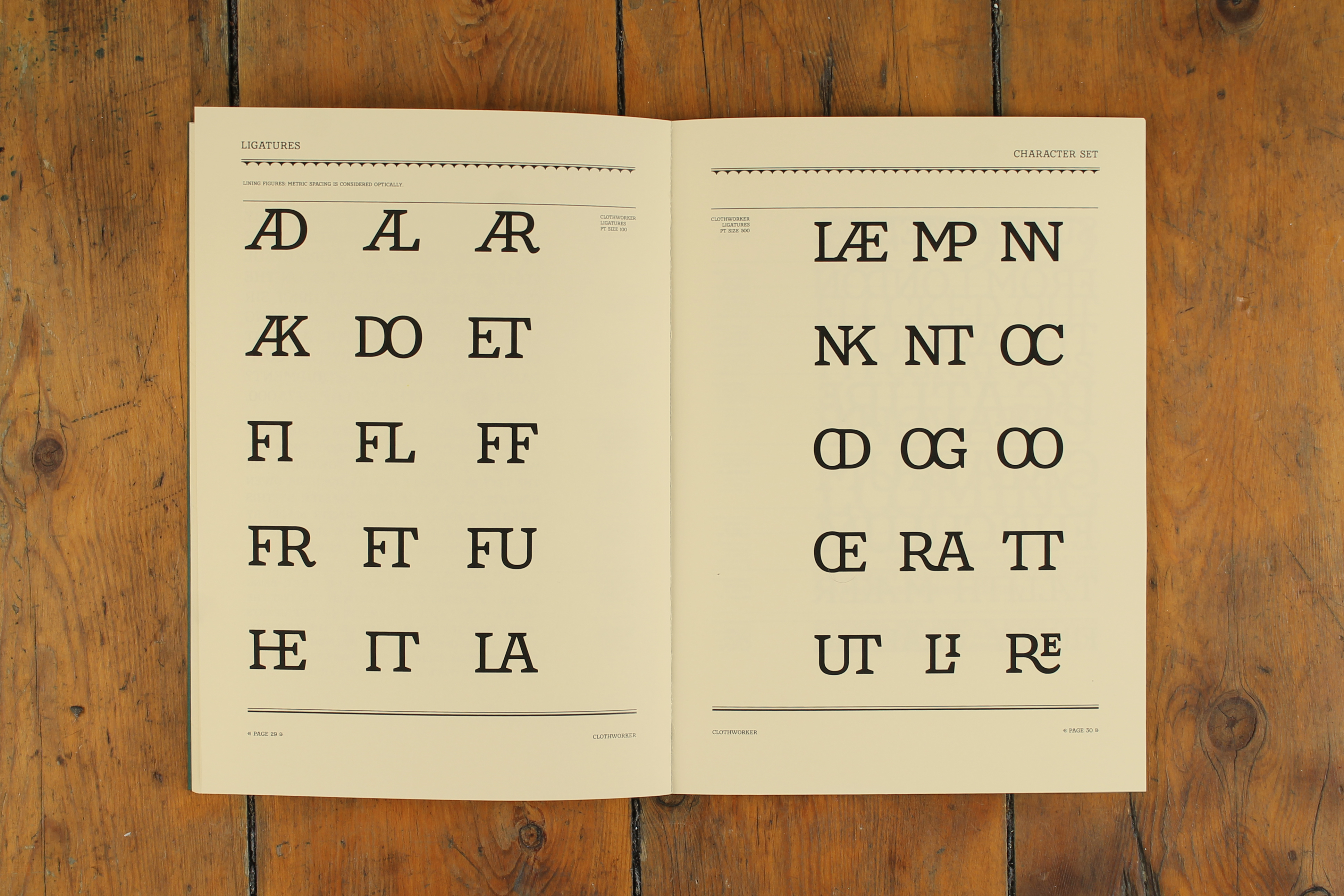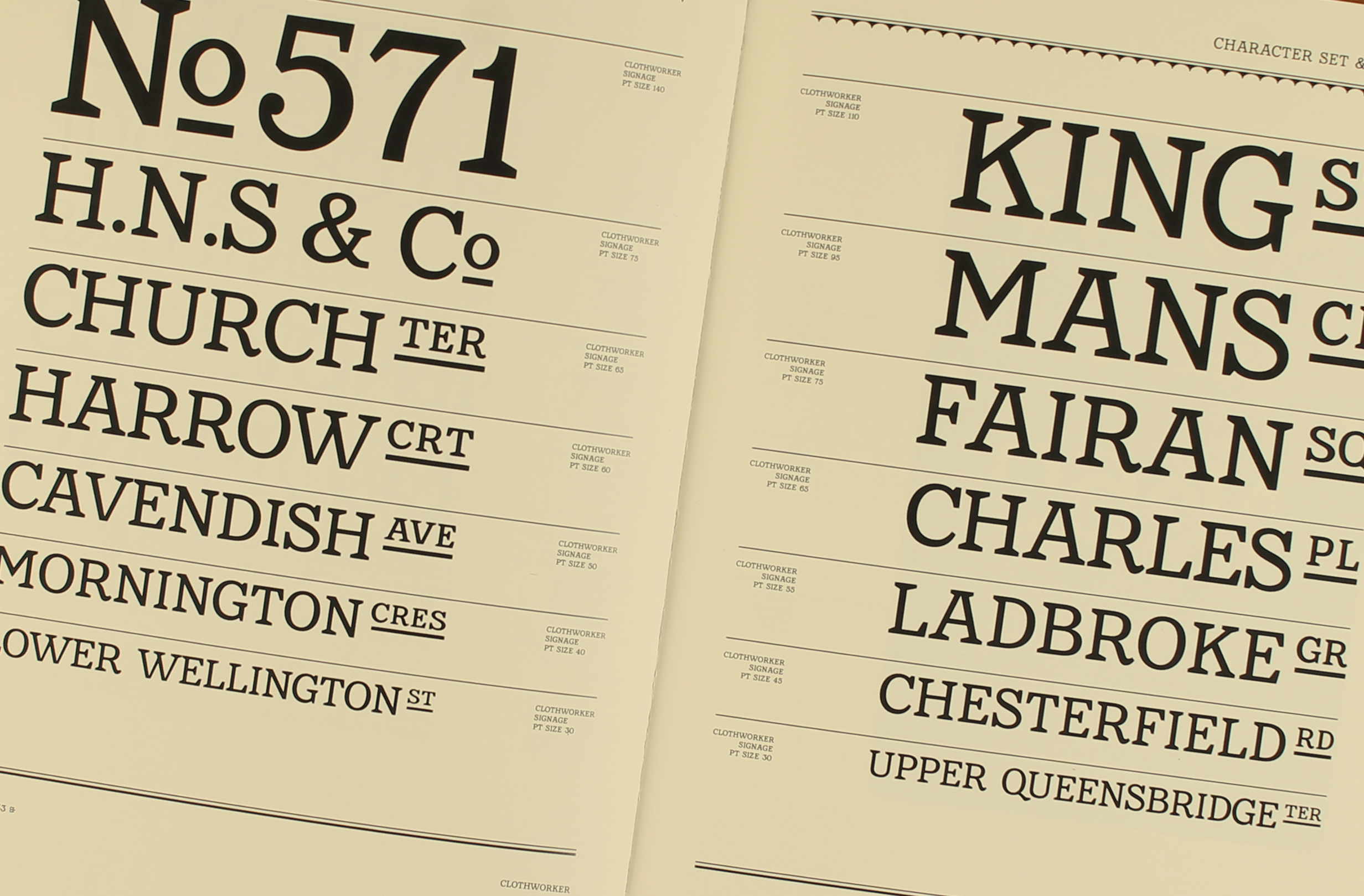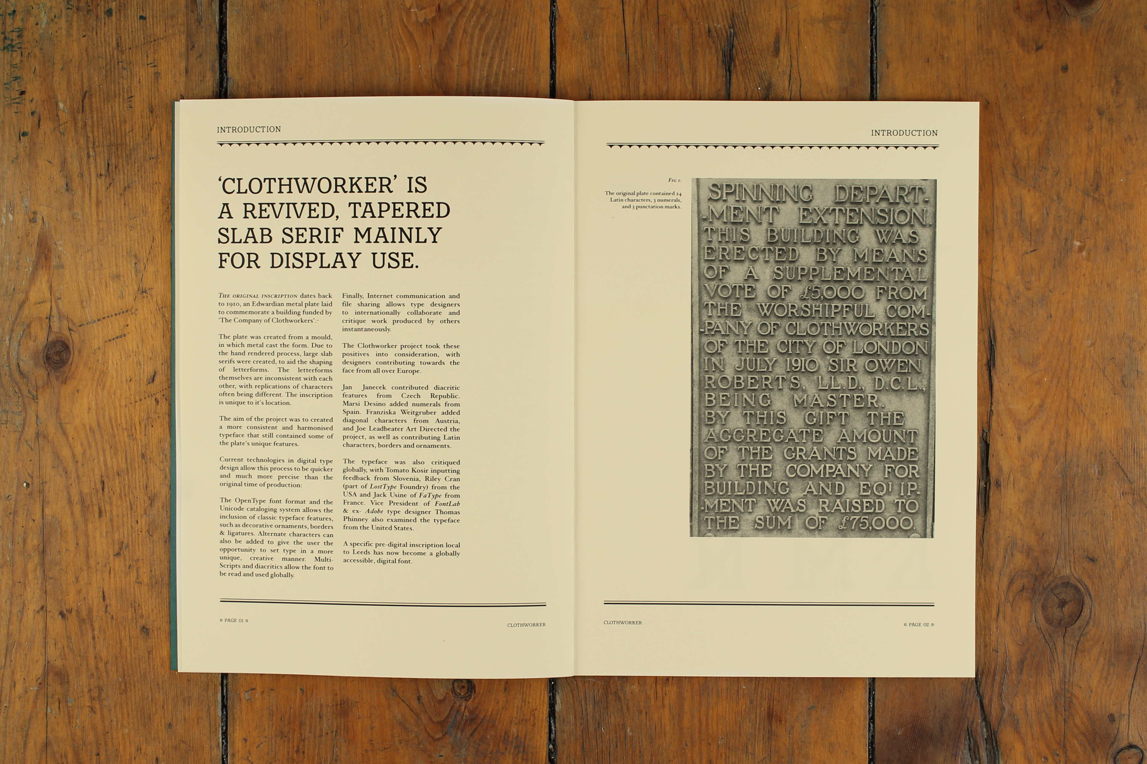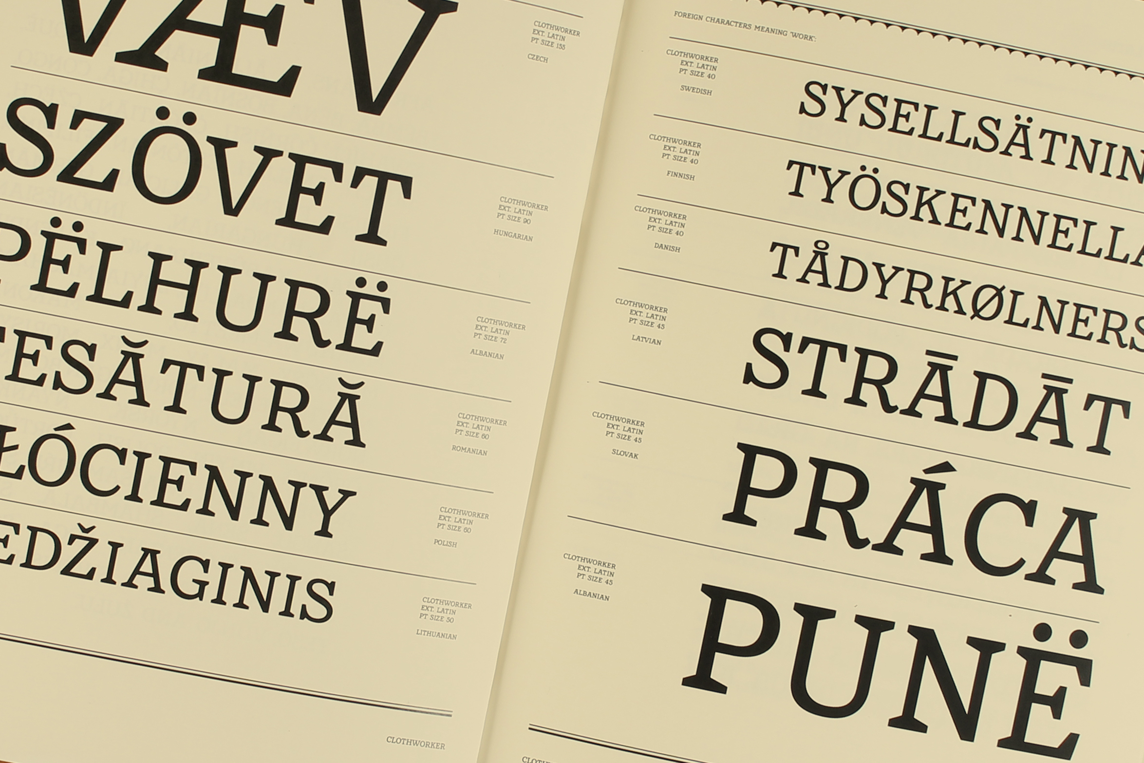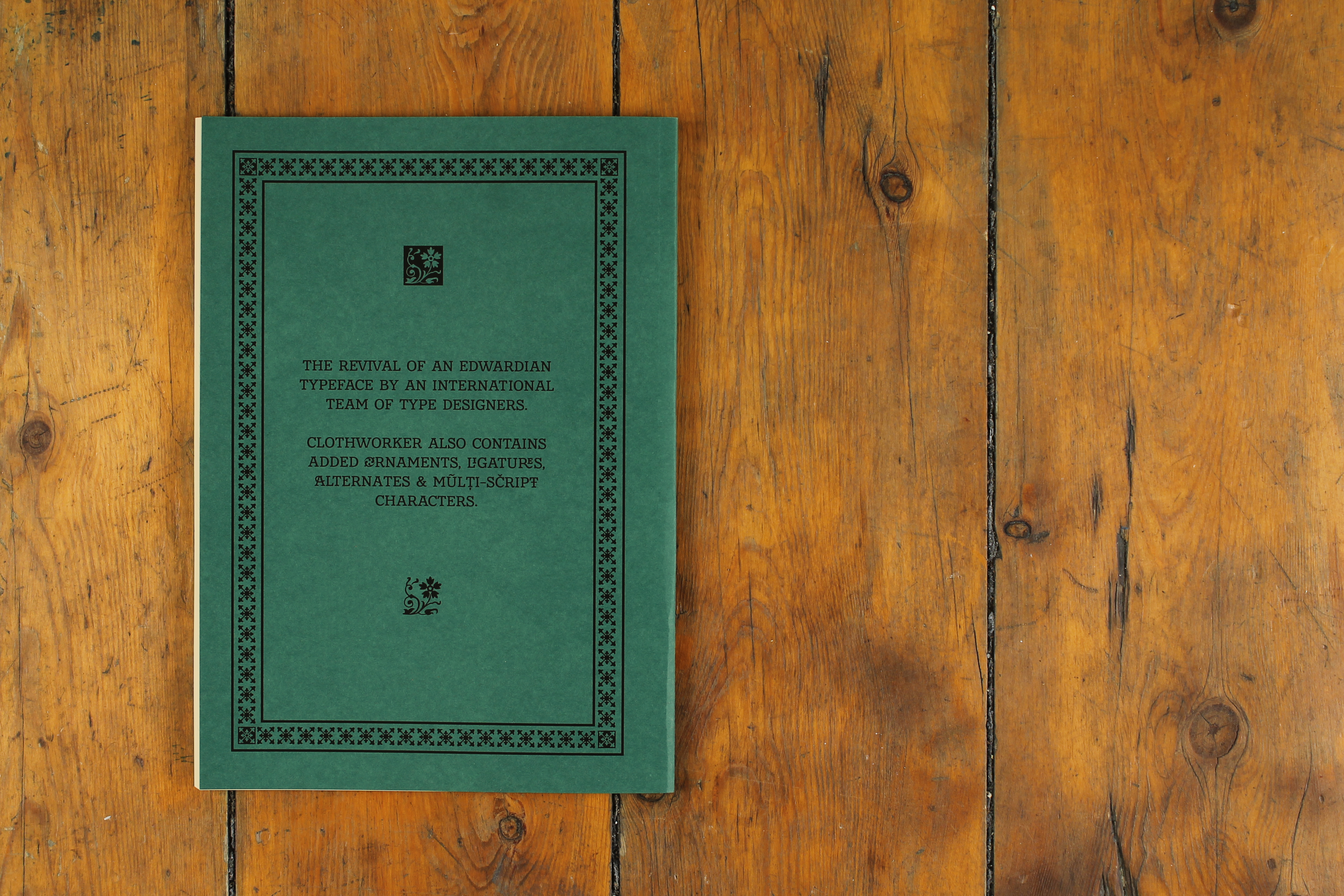 Traditionally an exclusive skillset, easily accessible tools democratised the industry, allowing type designers to work independently, with no previous craft skills. Font design software is also cheaper & easier to use than ever. OpenType allows the inclusion of over 65,000 characters. These include functional characters (like multi-scripts), and aesthetic options (like ligatures and swashes). Digital formats also allow globally filesharing. Originating from a Victorian inscription with 18 characters, Clothworker contains multi-scripts, ligatures, ornaments, borders and more.